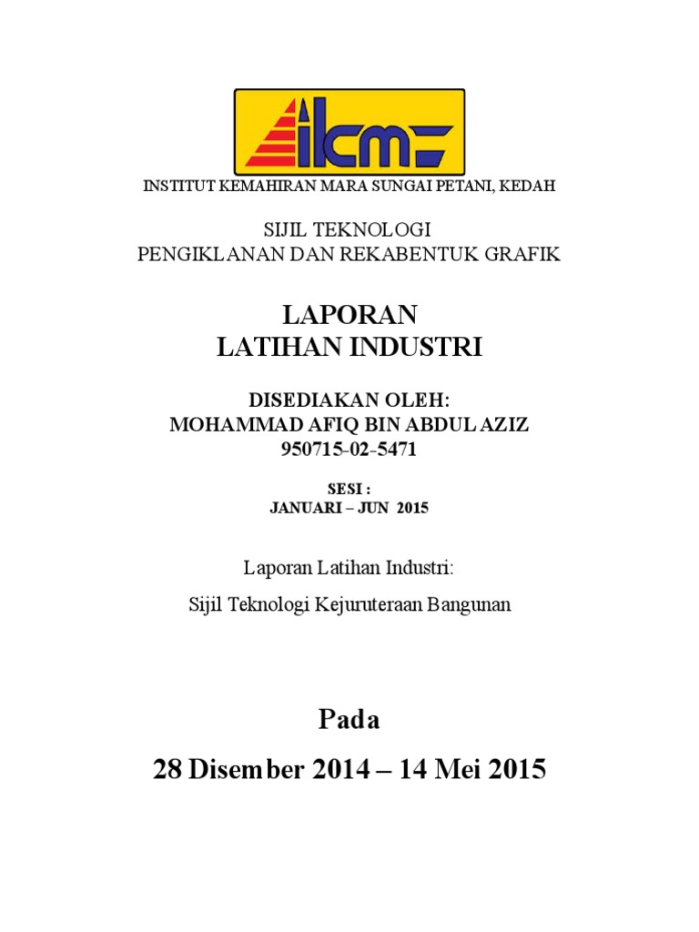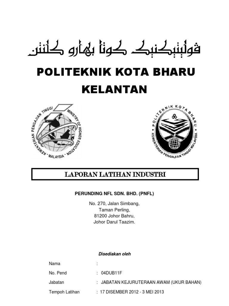 Ambil kesempatan ini dengan merujuk contoh. Contoh penulisan laporan akhir latihan industri politeknik. Segala perkara berkaitan dengan firma yang memerlukan penglibatan pelajar latihan industri dalam melaksanakan tugas, aktiviti bahagian dan organisasi dituruti justeru memberi impak yang besar kepada pelajar dari sudut menimba pengalaman, pengetahuan baru. Sama ada bm atau bi. .sebelum cetak, edit dulu yang mana perlu, mengikut kesesuaian dan keadaan,.
