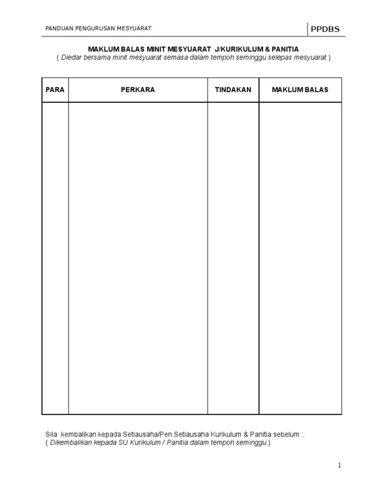 No.keluaran tarikh keluaran no.pindaan tarikh pindaan tarikh berkuatkuasa 06 01 disember. Muka surat para perkara tindakan maklum balas disediakan oleh: Jika tiada catatan, segala perbincangan implikasi kewangan. Contoh minit mesyuarat dengan maklum balas boleh dapatkan di sini. Mohon kepada semua ahli mesyuarat berkenaan untuk mengisi borang maklum balas berikut dan tekan 'butang submit'.