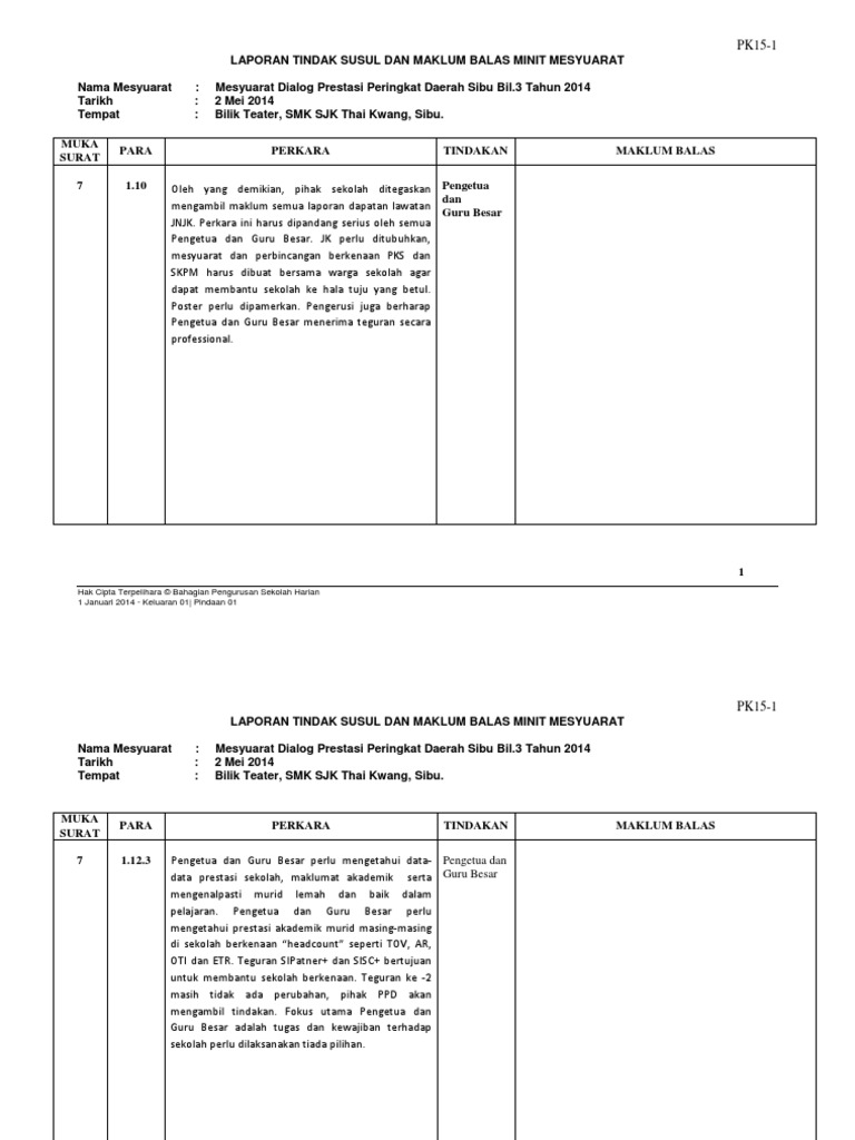 Borang Pk 07 5 Maklum Balas Minit Mesyuarat Kali Pertama 2017 from imgv2-1-f.scribdassets.com Contextual translation of maklum balas minit mesyuarat into english. Kp geografi 6.2 setiap minit mesyuarat perlu disertakan dengan maklum balas mesyuarat mengikut format yang telah ditetapkan. Wacana ilmu siri bimbingan guru (wisbg)sisc+ ppd darotajuk: Minit dalam menit menyediakan kemampuan penyuntingan komprehensif untuk minit mesyuarat, item agenda, senarai tugas, kehadiran, dan peringatan. Maklum balas mesyuarat (asal dan terkini). Maklum balas minit mesyuarat nama mesyuarat : Mesyuarat merupakan satu prosedur pentadbiran yang wajib dilakukan oleh setiap pengurusan sekolah. No.keluaran tarikh keluaran no.pindaan tarikh pindaan tarikh berkuatkuasa 06 01 disember.
