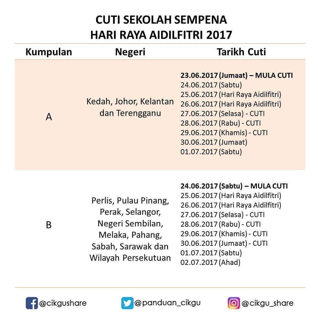 Related : Cuti Raya Puasa 2017 - Jadual Perjalanan Cuti Hari Raya Aidilfitri 2017 : Kerajaan pun telah mengumumkan tarikh cuti sekolah seminggu sempena aidilfitri 2017 bagi yang terlepas pandang admin petik kenyataan daripada kementerian pendidikan berhubung cuti sekolah bagi menyambut hari raya puasa nanti..