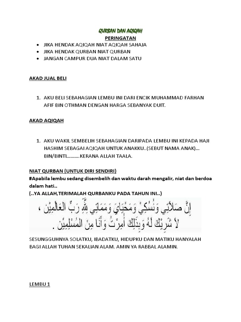 Adapun aqiqah dan kurban tidak demikian, sebagaimana yang telah nampak dengan jelas pada penjelasan kami di atas. * memberi kemudahan kepada manusia dalam. Tiada lafaz khusus untuk niat korban, dan boleh sekadar diniatkan dalam hati. Saya sangat recommend untuk menggunakan khidmat urusaqiqahqurban.com tanpa ragu dan prejudis. Alasan dari pendapat ini adalah: Dengan demikian, maka tidak diterima jika anda anda menyembelih sapi untuk kurban sekaligus untuk aqiqah anak anda. Hukum menyembelih sapi dengan niat qurban dan aqiqah. Koban pula, ada ustaz menyebutkan bahawa jika sebuah keluaga melakukan korban, ia boleh diwakilkan kepada satu bahagian sahaja. Ini artinya, ada satu amalan dilakukan dengan dua niat, yaitu niat berkurban dan niat beraqiqah. Akan tetapi sekiranya jika seseorang itu berkemampuan untuk melakukan ibadah qurban dan akikah, maka jalan yang terbaik adalah mengasingkan setiap satu. Semoga bisa dipahami dengan baik. Kami selalu terbuka untuk menerima saran dan kritik dari para pembaca. Doa adalah senjata kita sebagai umat muslim, dengan berdoa kepada allah berarti kita meminta kepada sang maha kuasa, dan memang sudah seharusnya begitu.